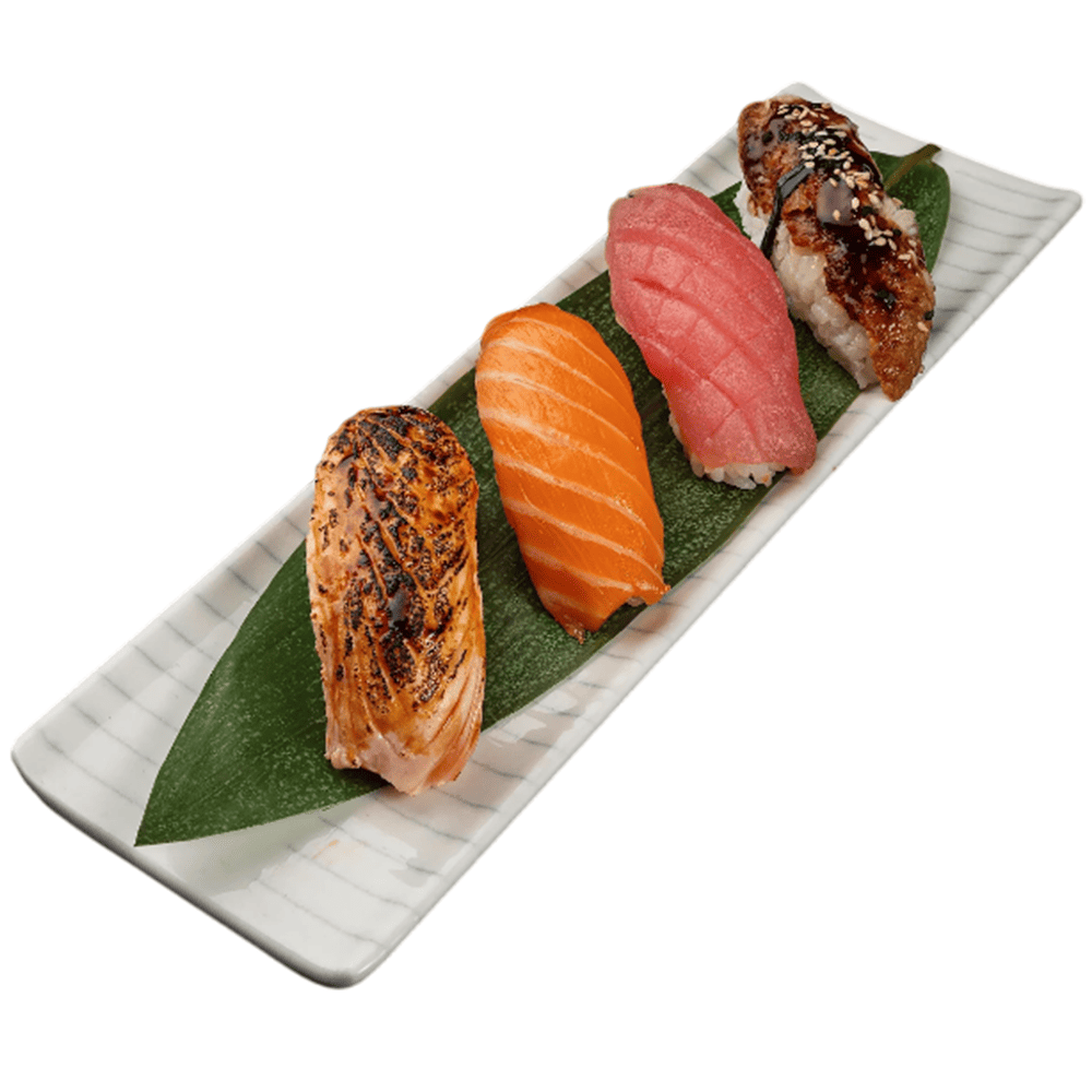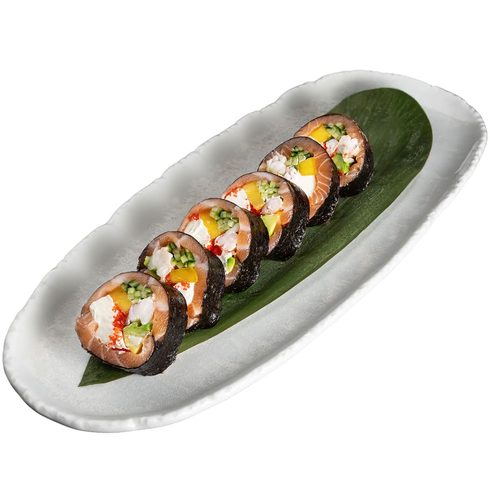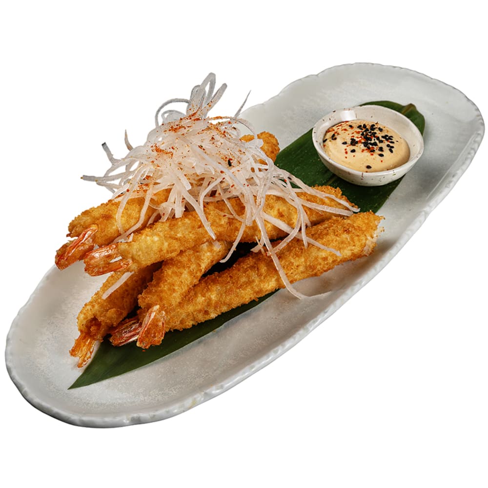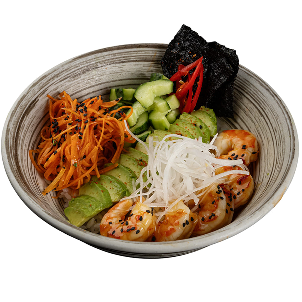 Suši rīsi, tīģergarneles, kimči burkāni, gurķis, avokado, čili, daikons, nori čipsi, sweet chilli fusion mērce, ponzu mērce, melnās sezama sēklas