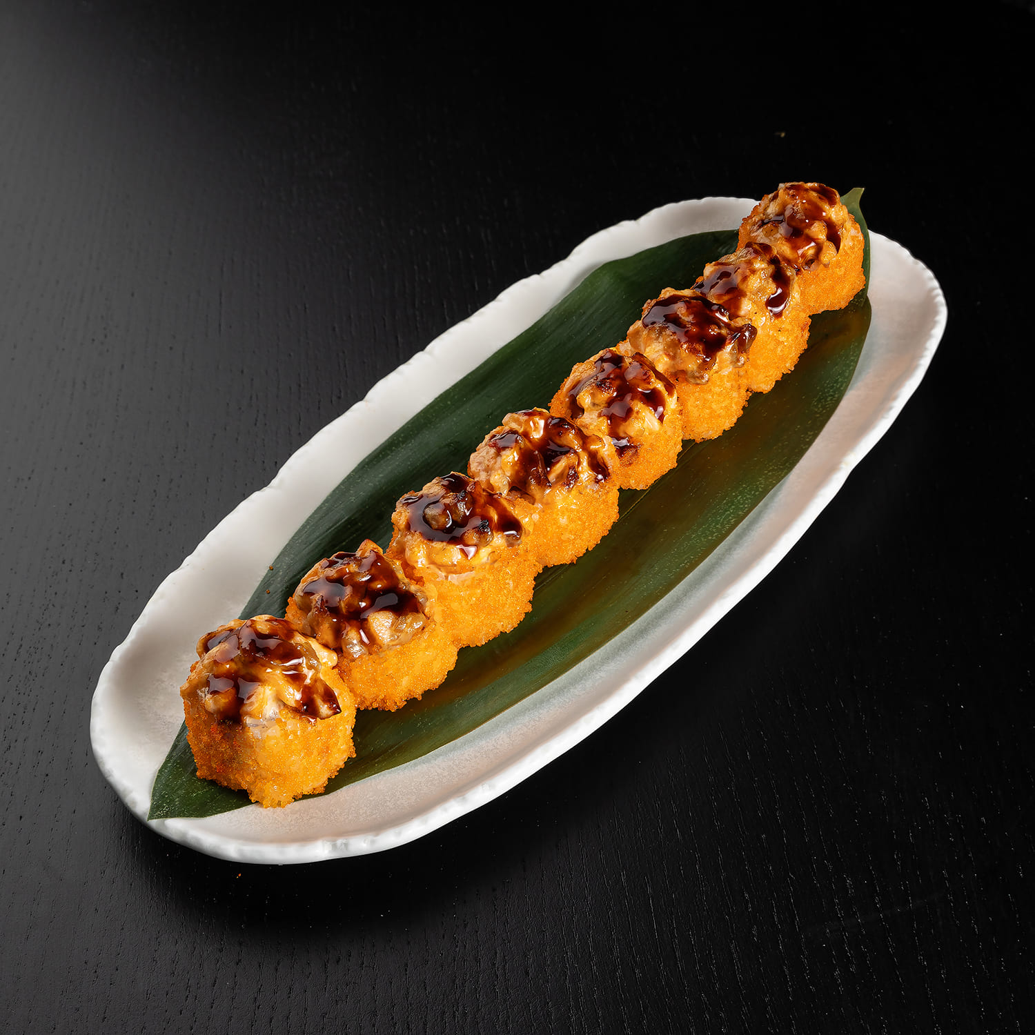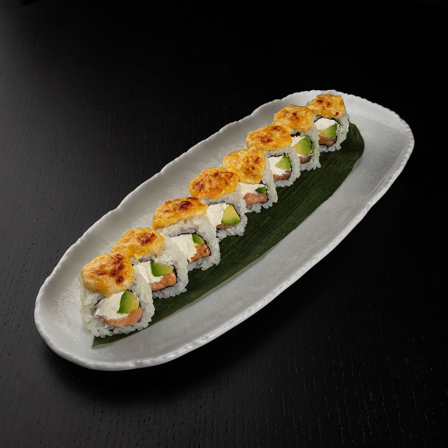 Cepts lasis teriyaki mērcē, siera cepurīte, gurķis, spicy mērce, masago ikri, kraukšķīgi sīpoli