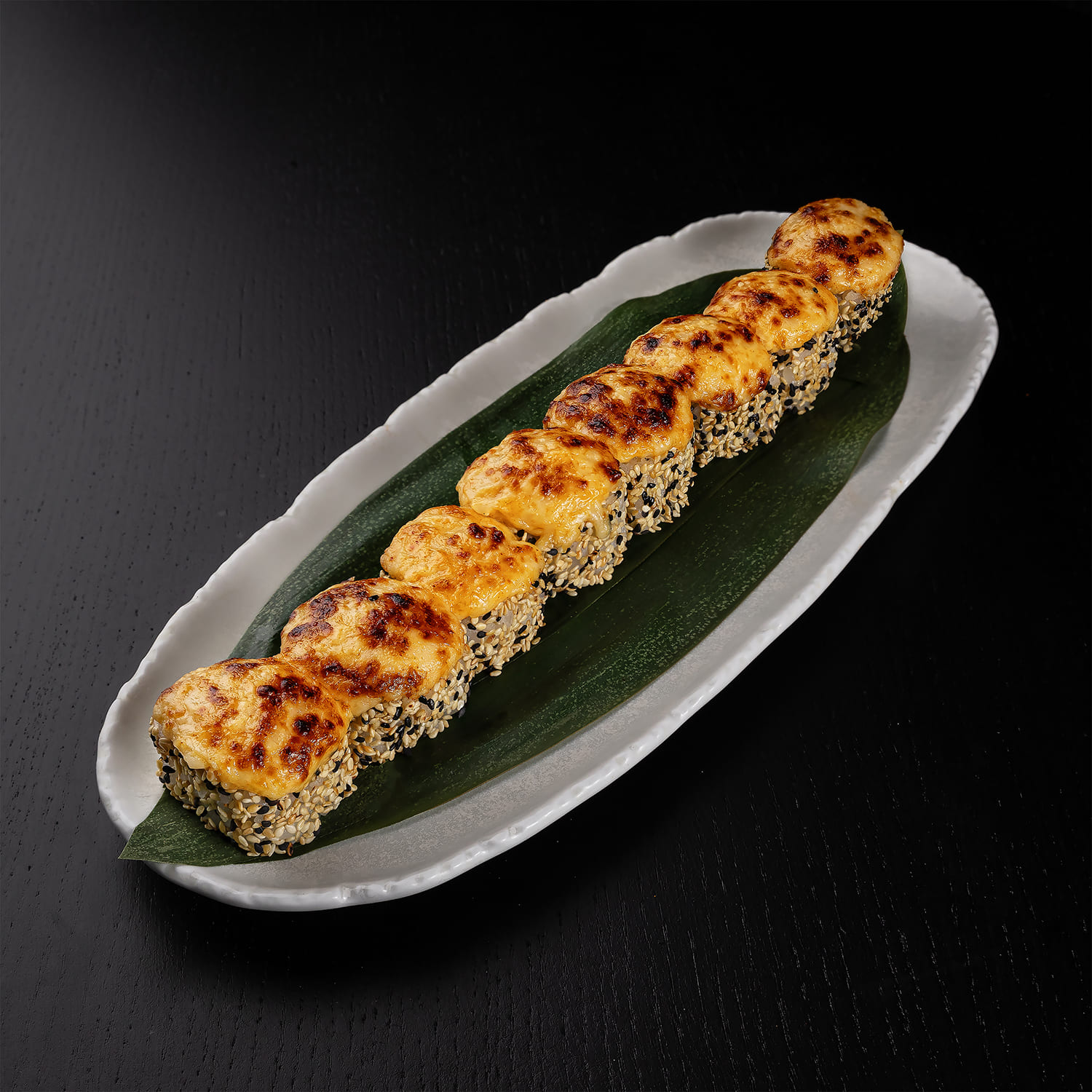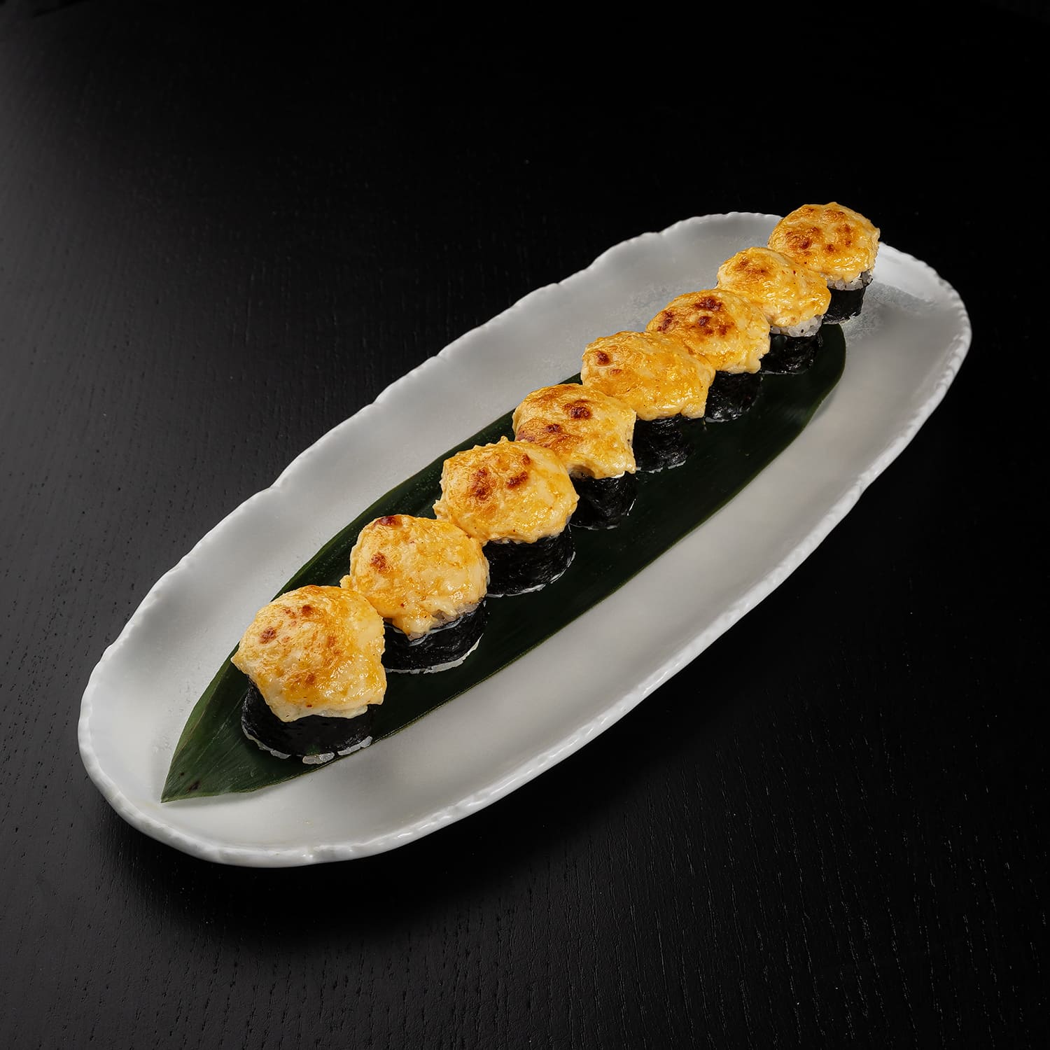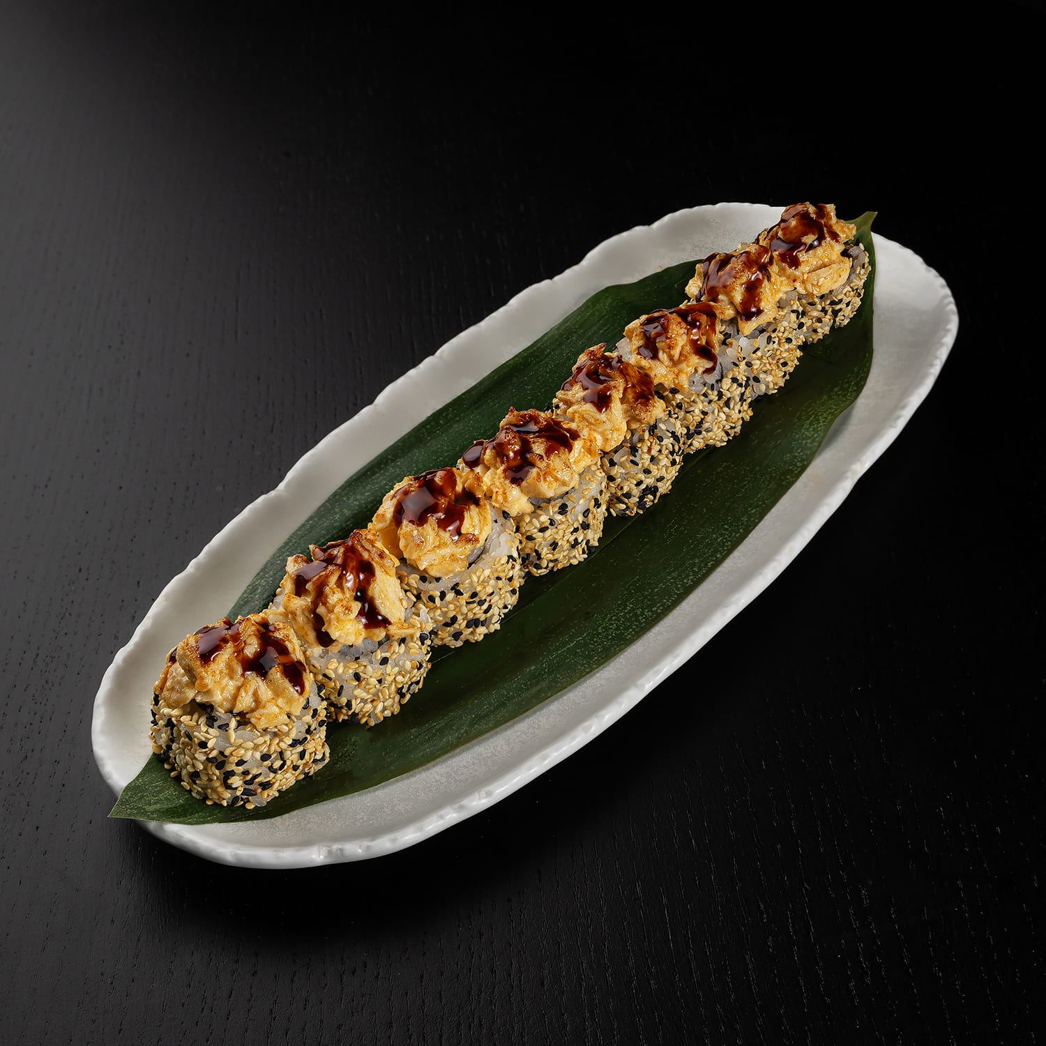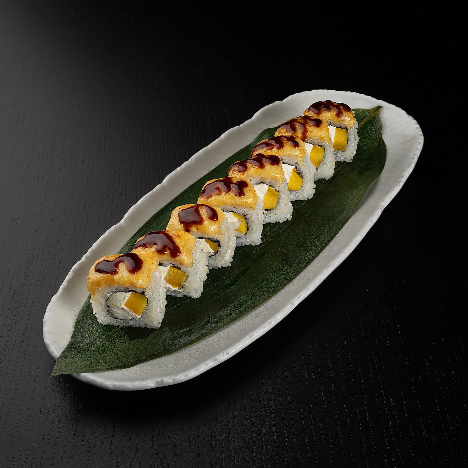 Tīģergarneles, mīdijas, siers, masago ikri, spicy mērce, teriyaki mērce