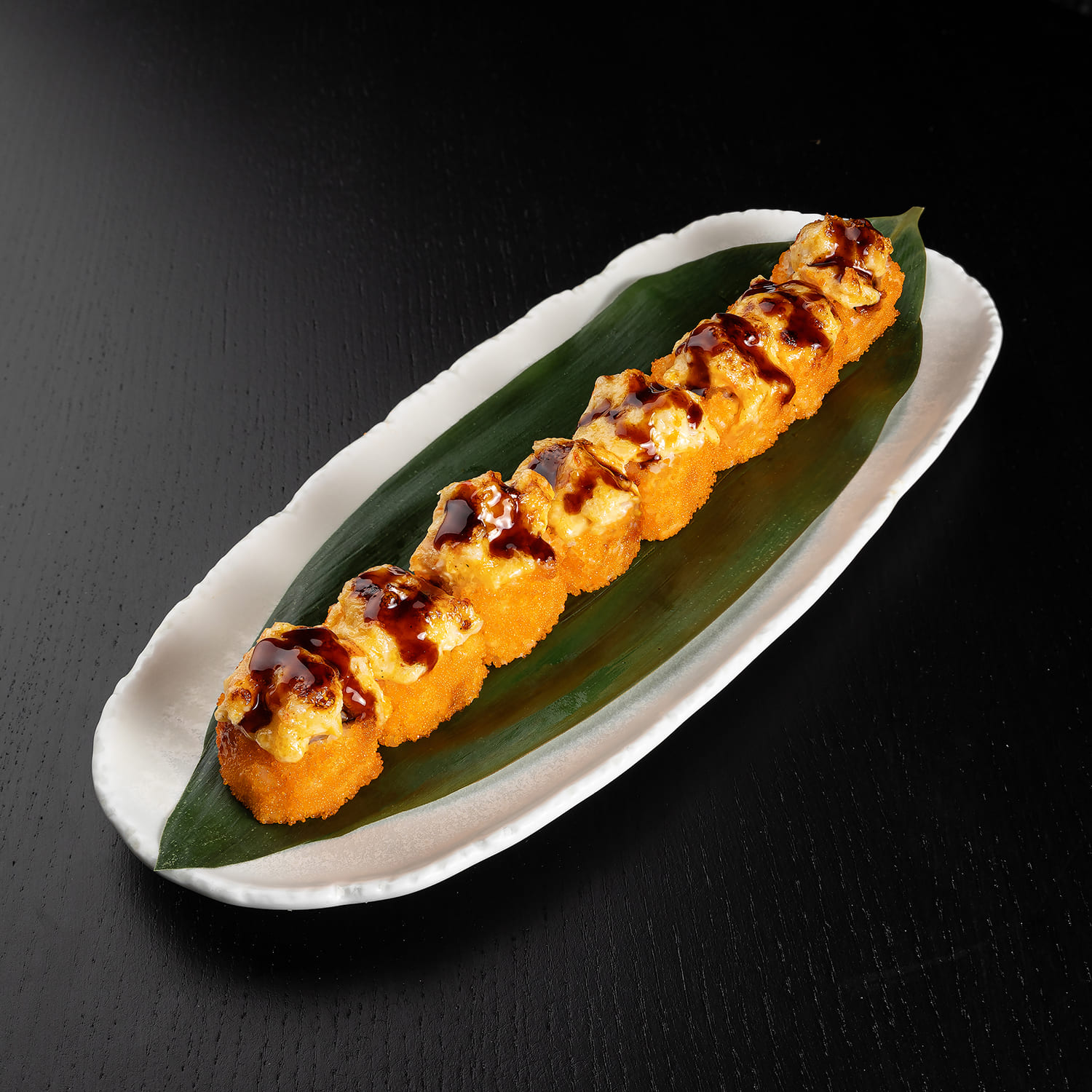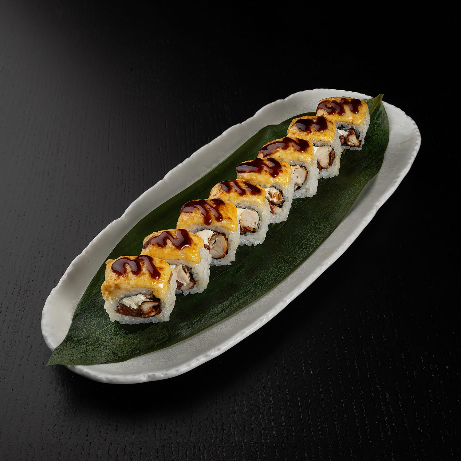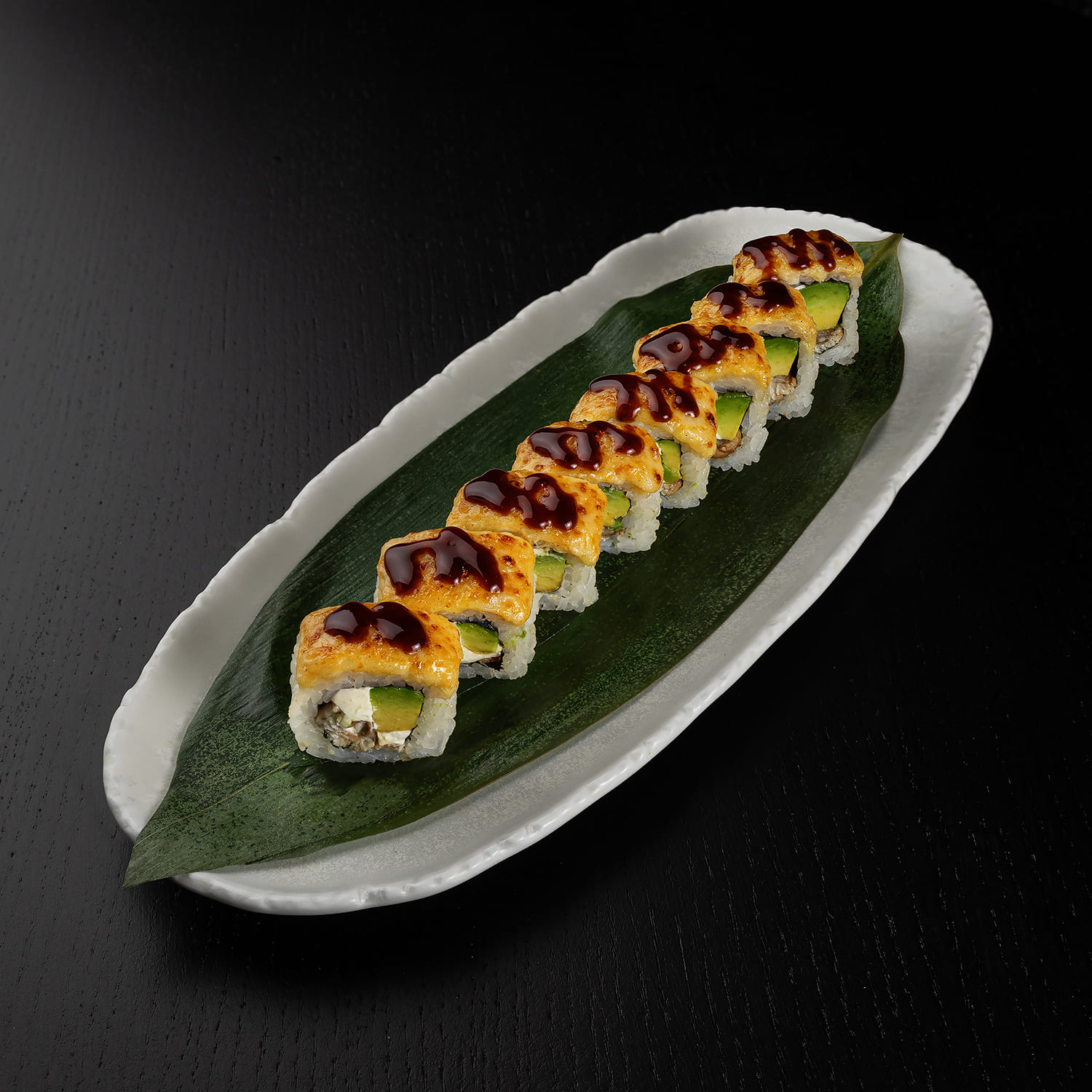 Tīģergarnele, avokado, siers, siera cepurīte, spicy mērce, teriyaki mērce