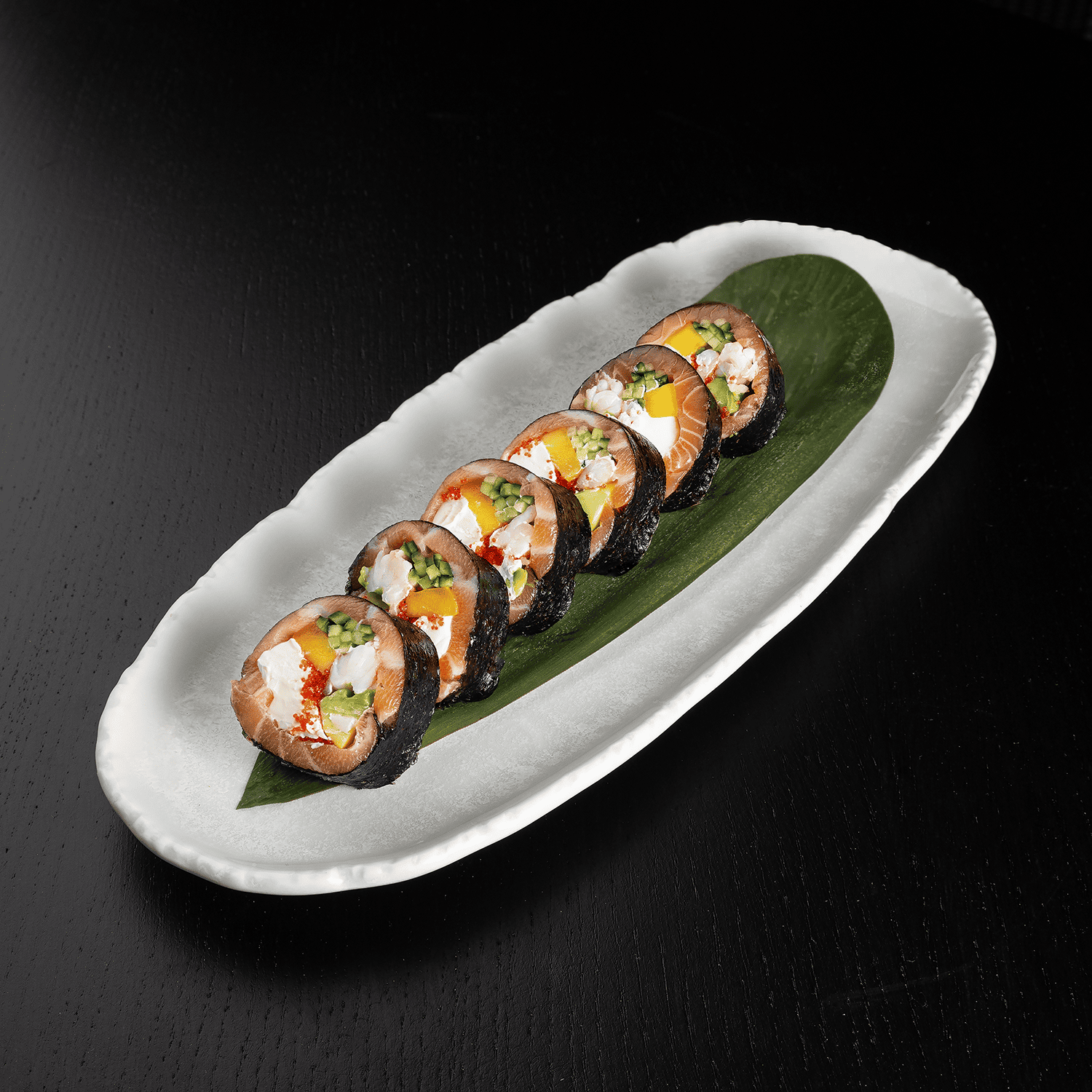 Lasis, tīģergarnele, mango, avokado, gurķis, masago ikri, siers, nori