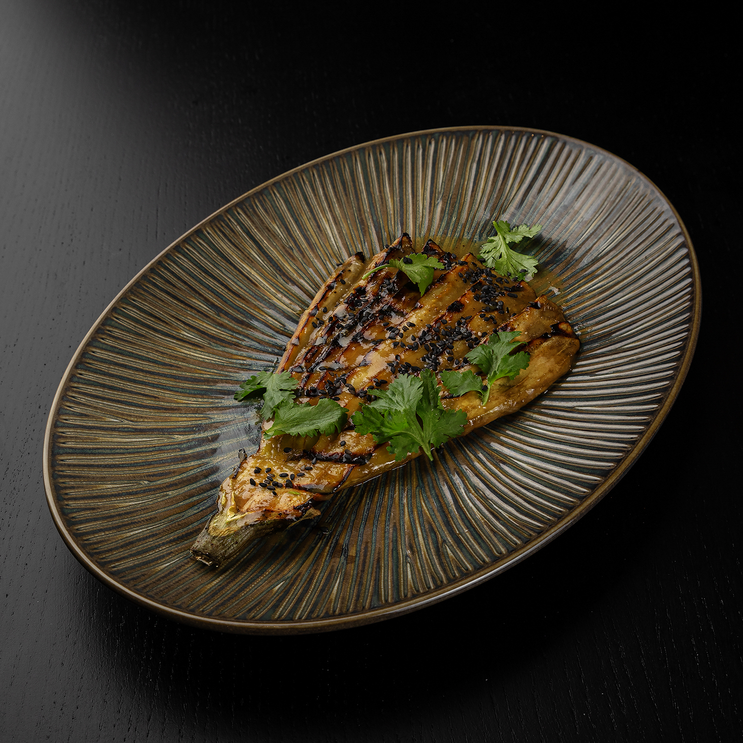 Baklažāns, miso glazūra, sezama sēklas, kinza