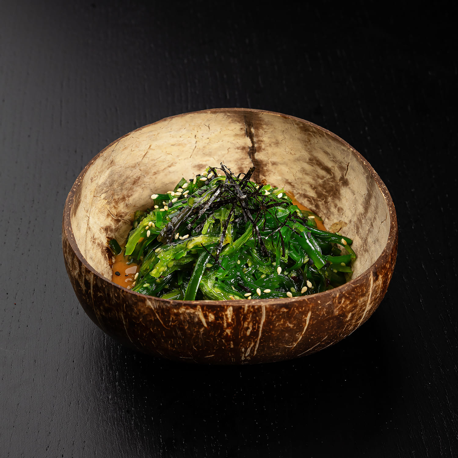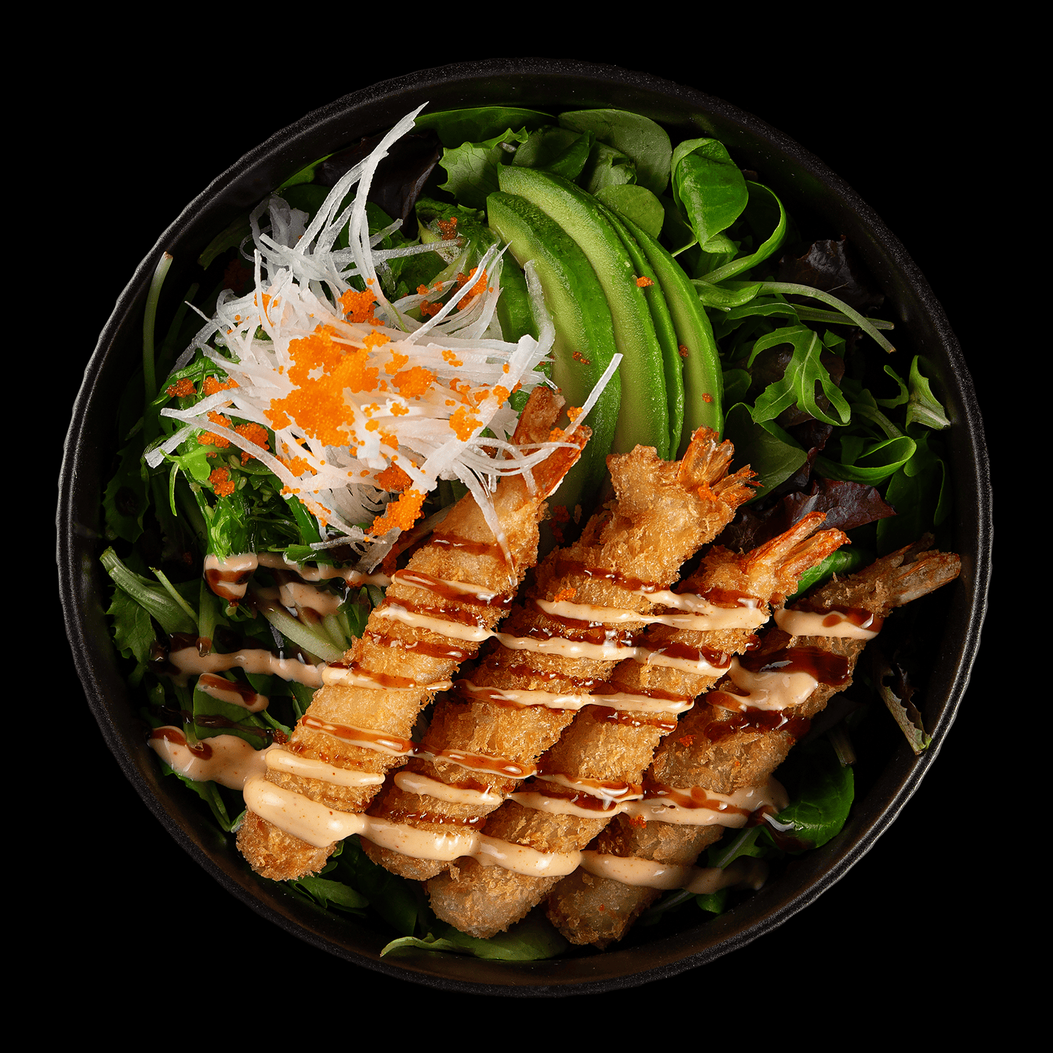 Tīģergarneles tempurā, jūras aļģes “čukka”, gurķis, baltie redīsi, avokado, pikantā mērce, terijaki mērce, salātu miks.