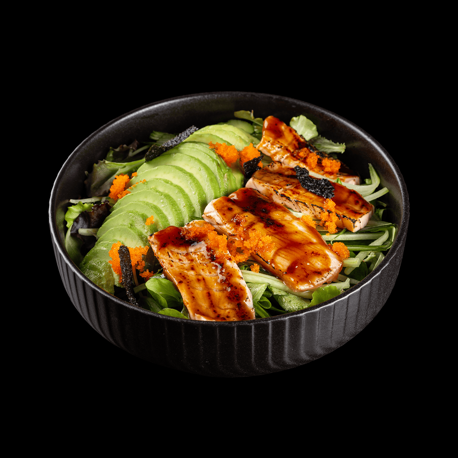 Tataki lasis, avokado, salātu miks, spinātu lapas, gurķis, yasai mērce, masago ikri, nori čipsi.